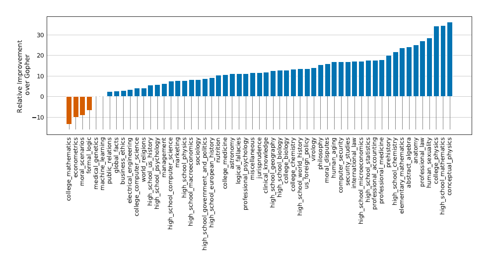 Figure 2: MMLU. Chinchilla outperforms Gopher in almost all tasks (51/57), with a 7.6% increase in average performance.