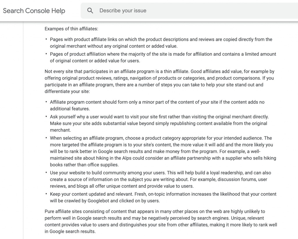 Affiliate Sites: Google knows that website owners need to make money to run their business, and affiliate marketing is a legitimate way to do it. However, sites that are created solely to refer traffic away and make an affiliate commission are not looked favorably by Google. Try to show that you have at least some sliver of non-monetary reason to be there.