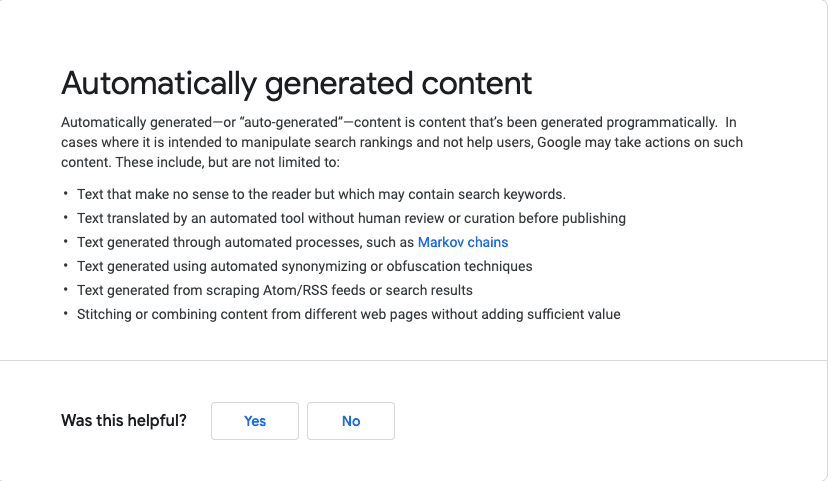 Autogenerated Content: This just screams spam. Google hates spam. Enough said.