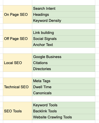 Things like "keyword research", "on page", "off page", "technical seo", etc.