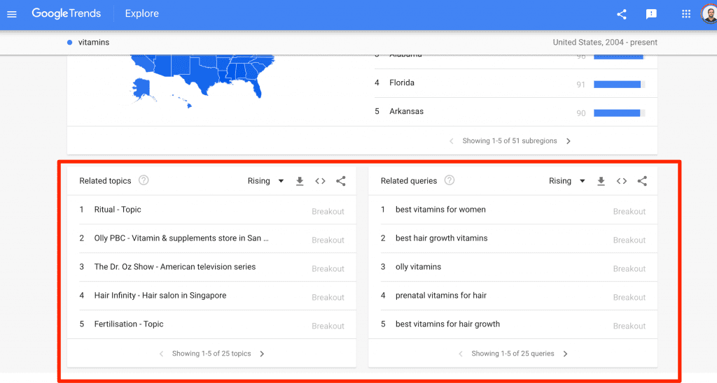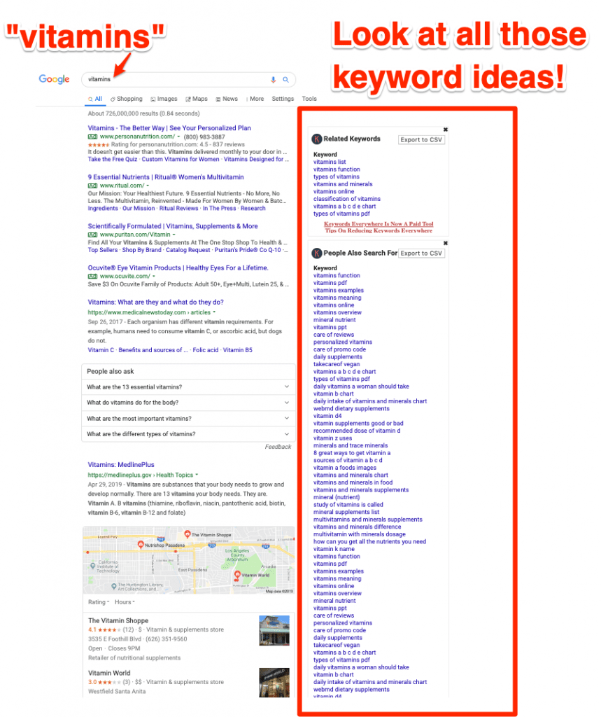 For example, if you search "vitamins" and scroll down just a bit you will see this "people also ask" area - giving you even more long-tail keyword search ideas:
