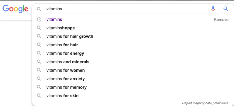 But, if you start typing the letter a next, as in "vitamins a" you will get an autocomplete list of terms people use that begin with "vitamins a". And that works for other letters as well.